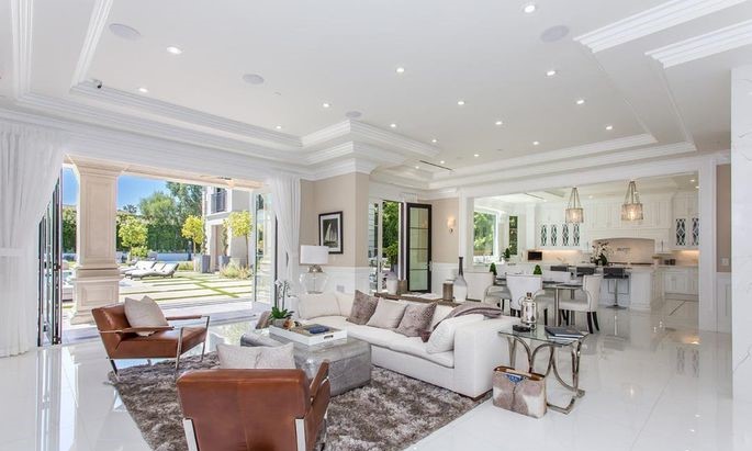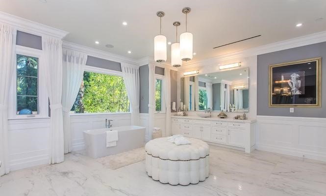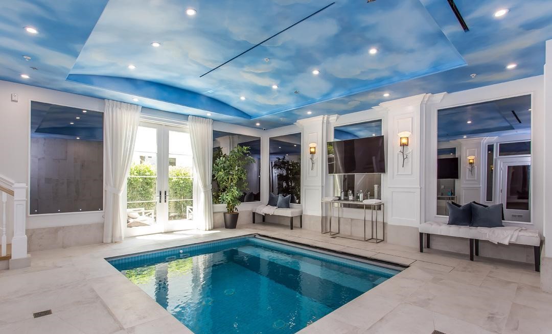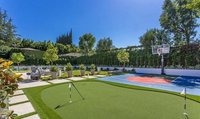 The home features a theater, sauna, indoor pool, fitness studio, two separate car garages, basketball court, putting greens, an outdoor pool, and a cabana.